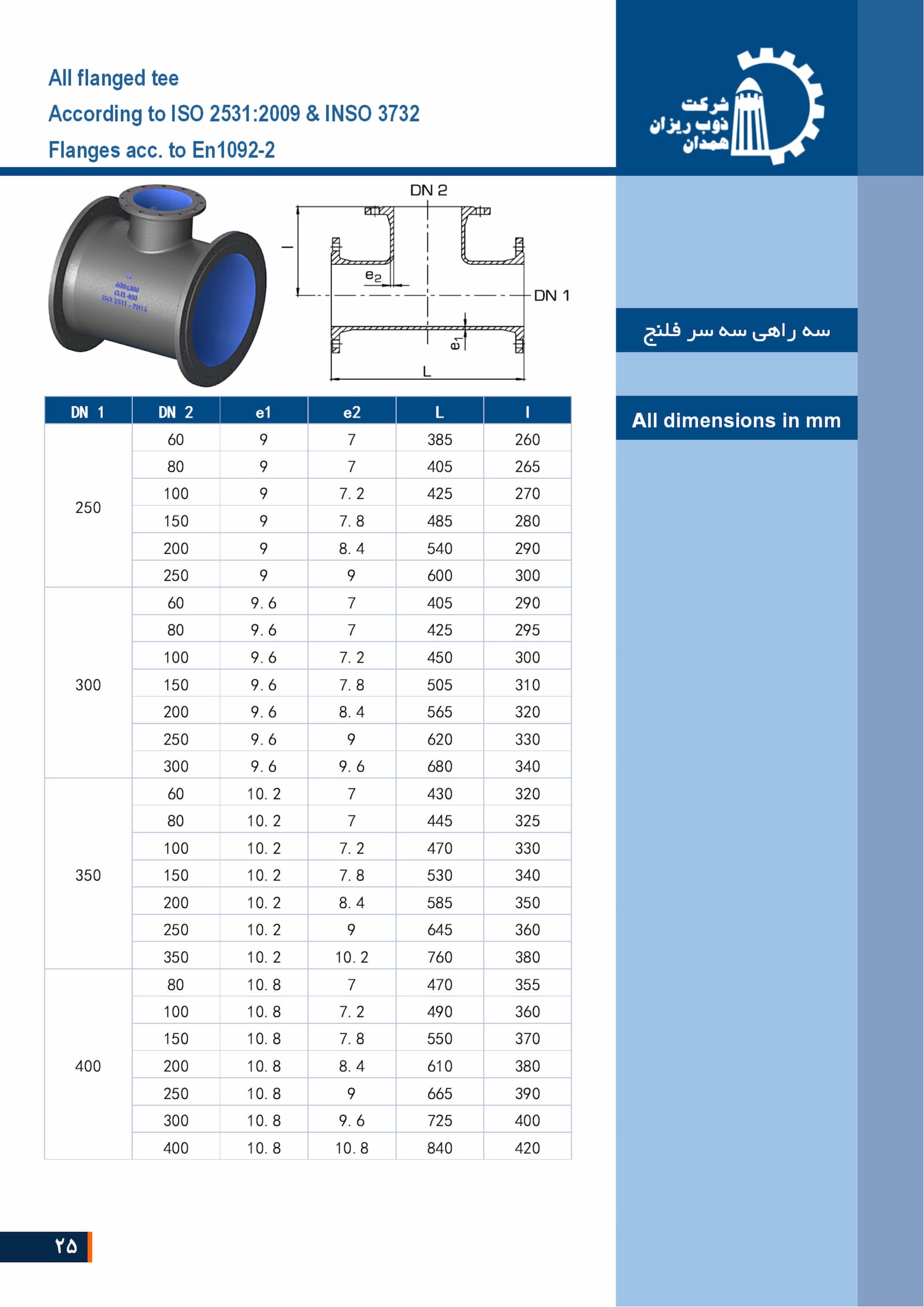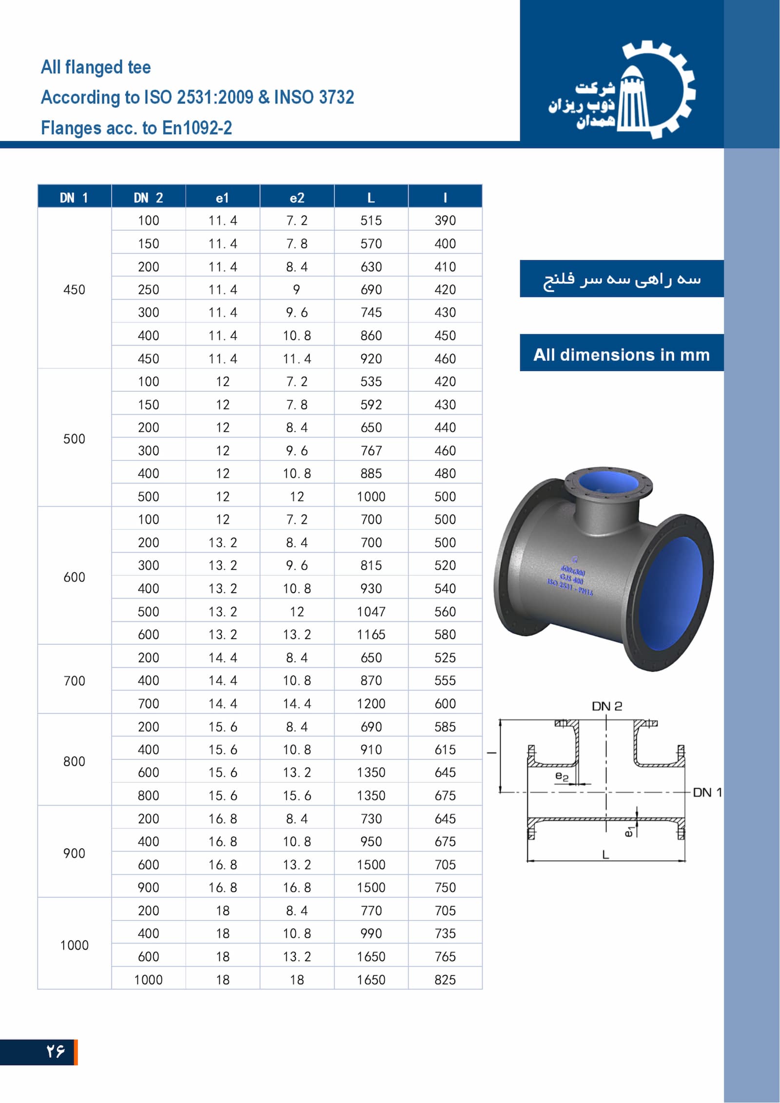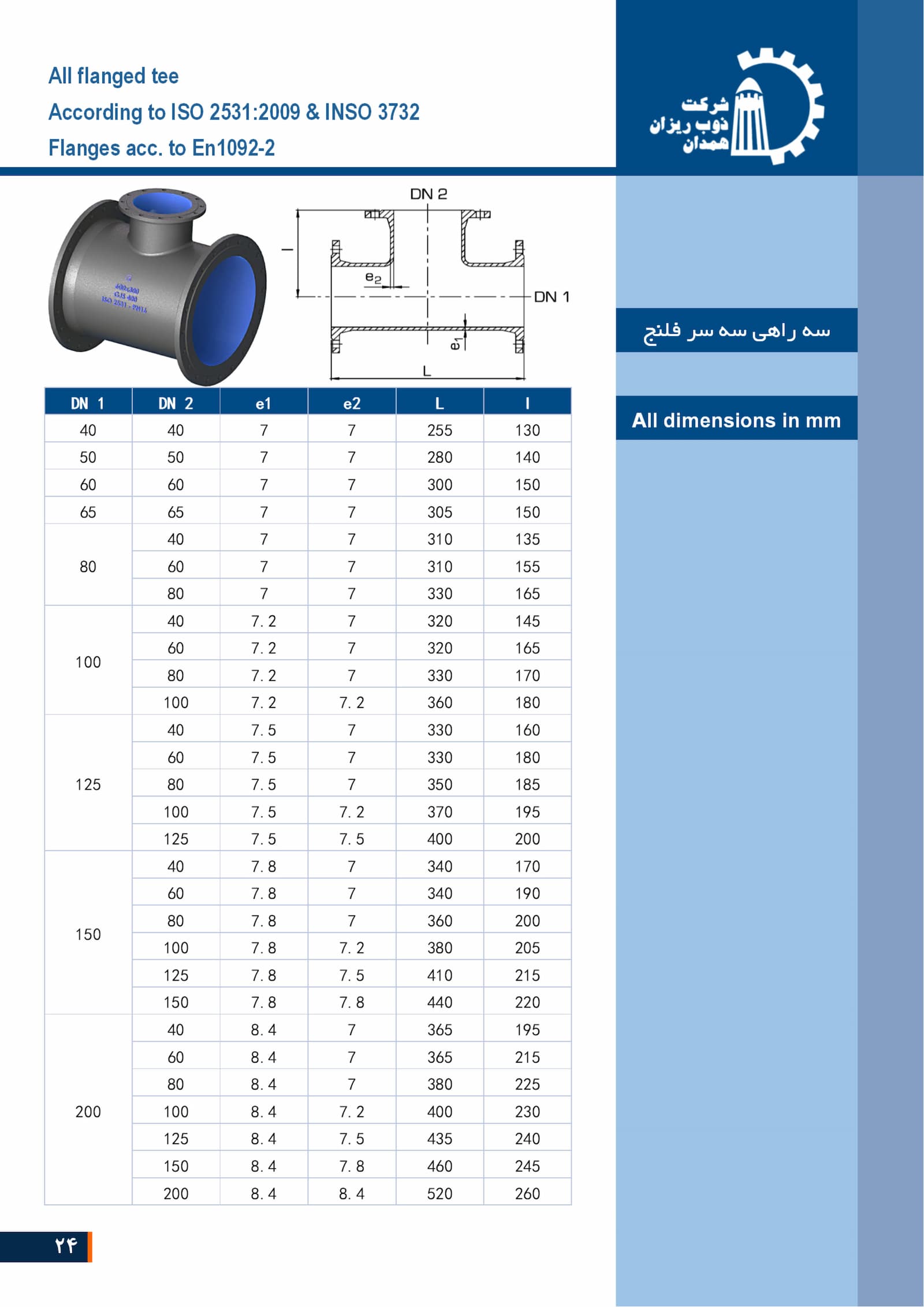 One of the important features of this valve is that it is manufactured and supplied according to the national standard INSO 3732:1392 with the approval of the General Directorate of Standards. These cast iron fittings (gray, ductile) such as tees, elbows, flanged adapters are manufactured and designed in different classes and at pressures of PN10 and PN16 in diameters of 80 to 1000.