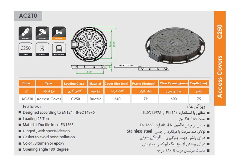 دریچههای چدنی با هدف کاهش خطر سقوط اشیا و انسانها در اماکن مختلف یا جلوگیری از پخش شدن بوی فاضلاب در سطح شهر مورد استفاده قرار میگیرند و از آنجایی که این دریچهها متناسب با استانداردهای جهانی و تست فشار تولید میشوند، خریدار نگرانی بابت اصالت و کارایی آنها ندارد. دریچه منهول چدنی گرد داکتیل سایز 64 با رینگ 79 سانتی متر و تست فشار 25 تن یکی از محصولات پرطرفداری هست که با توجه به استانداردهای INSO14976 , EN 124 تولید شده و فشار 25 تنی را تحمل کرده است. به همین علت توانایی تحمل وزن تا 26-27 تن را دارد. این دریچه از جنس چدن داکتیل مطابق با استاندارد EN 1563 تولید شده و وجود لولای ضد سرقت با میلگردی که جنسی ضدزنگ دارد، باعث راحتی در استفاده از آن در شرایط آب و هوایی متنوع شده است.