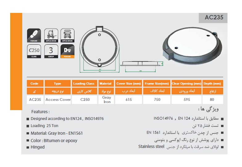 دریچه منهول چدن خاکستری گرد سایز 62 (کد AC235) – رینگ 75 سانتی متر